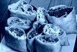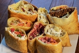 Porção com pastel da culinária brasileiro com variados sabores em prato branco com fundo de mesa de madeira