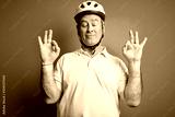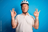 Middle age hoary cyclist man wearing bike security helmet over isolated blue background relax and smiling with eyes closed doing meditation gesture with fingers. Yoga concept.