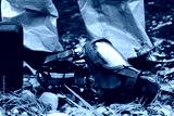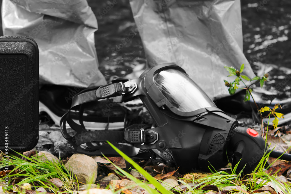 mask to protect the respiratory system and vision lies on the grass against the background of the legs in a protective suit
