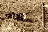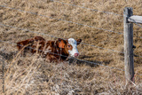 A newborn baby calf laying in the grass in Saskatchewan, Canada