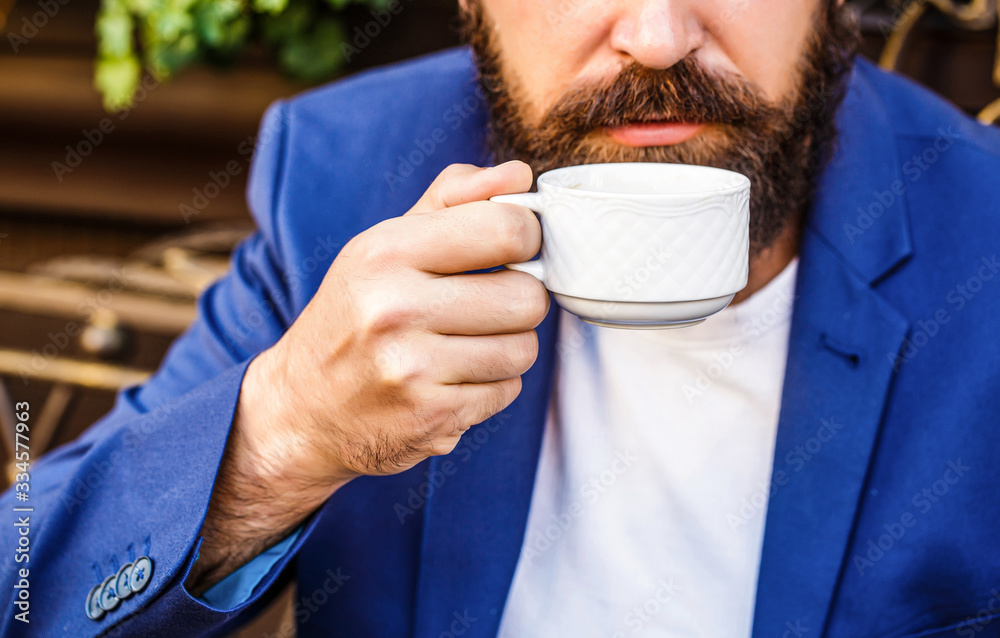 Beard man hold coffee or coffe cup at cafe in the morning. Cup of coffee. Cappuccino and black espresso coffee cup. Coffee drink. Bearded man, hands holding a hot coffe cups. Coffe time