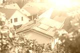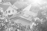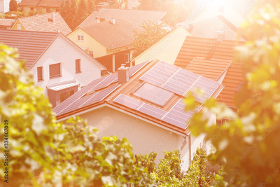 Solar panels on the tiled roof of the building in the sun. Top view through grape leaves. Image for illustration on energy, self-reliance, autonomy and security.