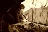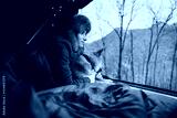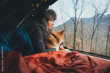 Young hipster girl traveling with shiba inu dog sitting in sleeping bag enjoying amazing view from camping tent, Vacation Leisure Nature Concept