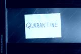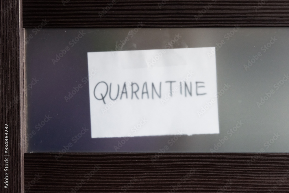 COVID-19 coronavirus concept, closed glass door with note Quarantine behind it. Corona virus outbreak, countries impose quarantine and restrictions.