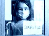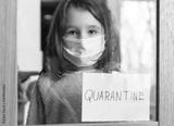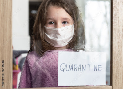COVID-19 coronavirus concept, little girl in face mask looking through window with note Quarantine at home. Sad kid during quarantine due to COVID.