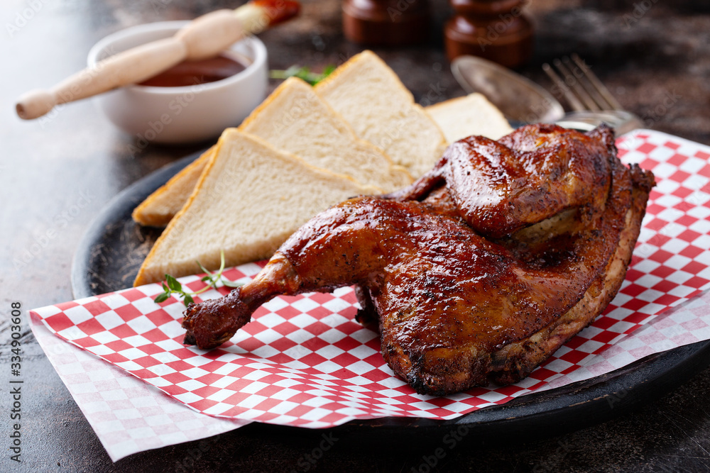 Smoked chicken half with toast and barbeque sauce
