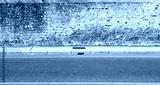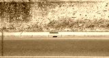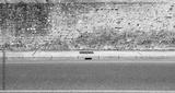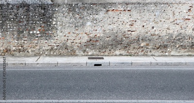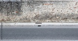 Grunge weathered concrete wall with exposed stones and bricks. Cement sidewalk and asphalt road in front. Background for copy space