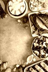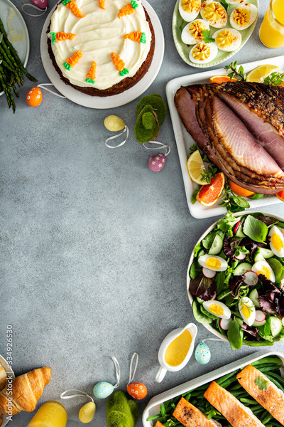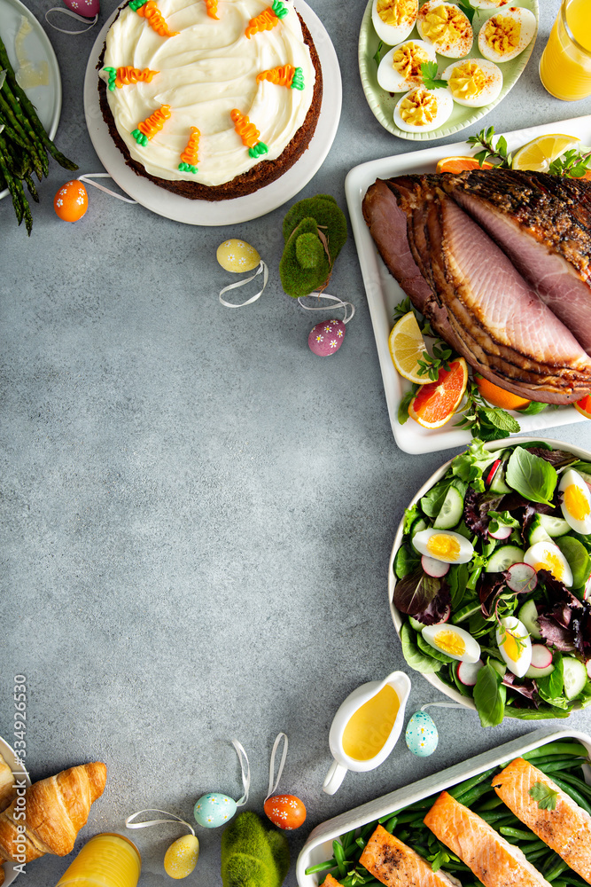 Big traditional Easter brunch with ham, quiche lorraine and carrot cake and copy space for text