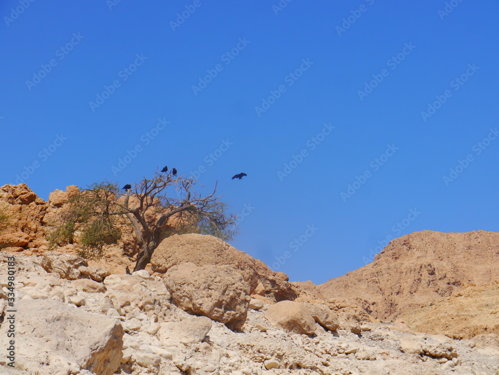 desert scene with clear blue sky, dry tree and group of black ravens near Ein Gedi National Parc and the dead Sea, Israel