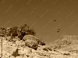 desert scene with clear blue sky, dry tree and group of black ravens near Ein Gedi National Parc and the dead Sea, Israel