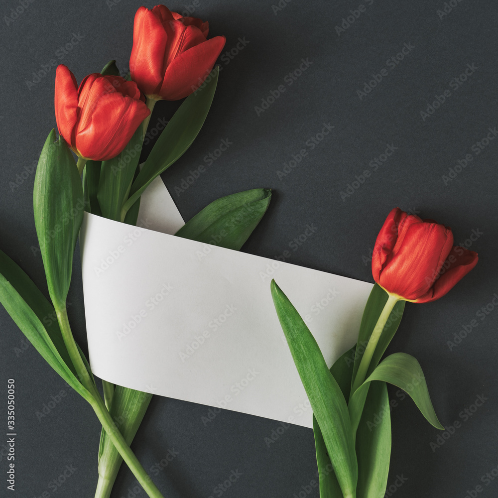 Creative flat lay composition with paper card note and spring flowers. Realistic aesthetic look. Contemporary style.