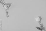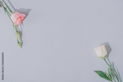 Creative flat lay composition with spring flowers and gray background. Natural sun light lighting and sharp shadows. Realistic aesthetic look. Contemporary style.
