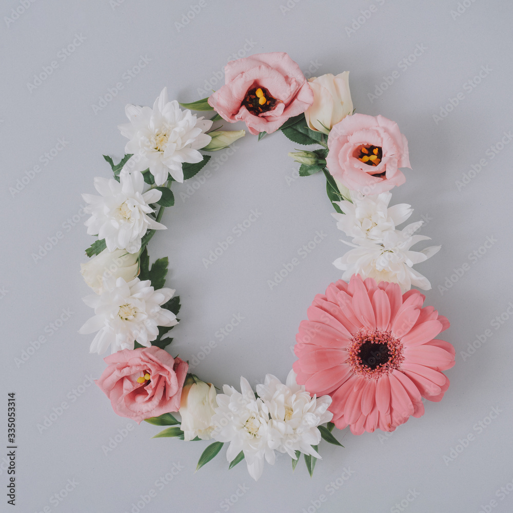 Creative flat lay Easter egg composition with spring flowers and gray background. Natural sun light lighting and sharp shadows. Realistic aesthetic look. Contemporary style.