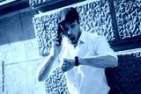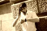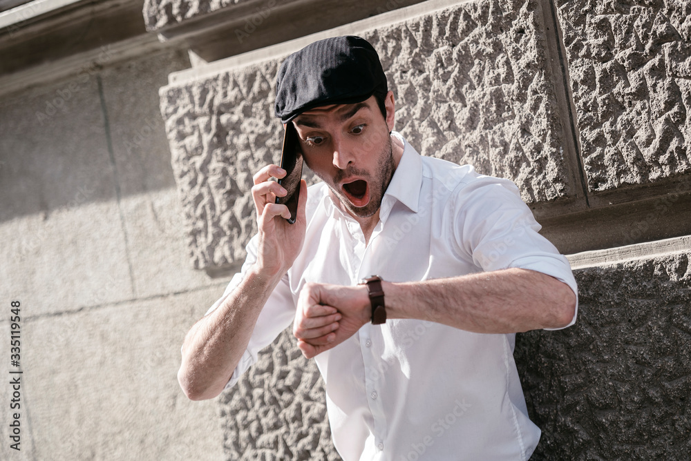 Single stylish male having conversation on his cellphone and shocked looking on watch