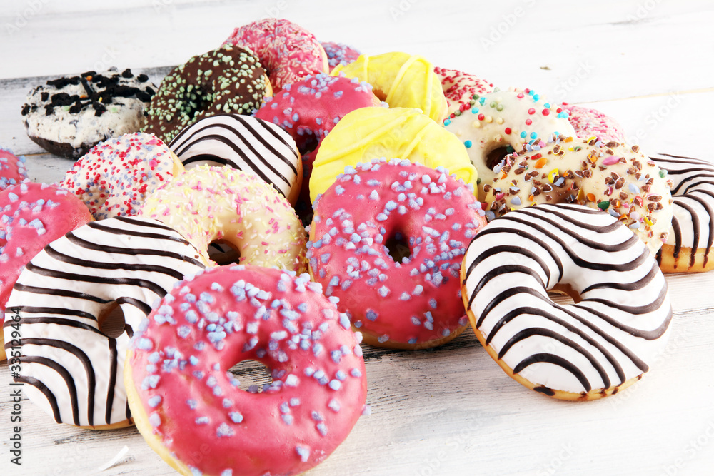 donuts in different glazes with chocolate, sprinkles and stripes