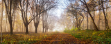 Panorama of footpath with fallen leaves through foggy forest in autumn