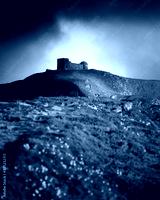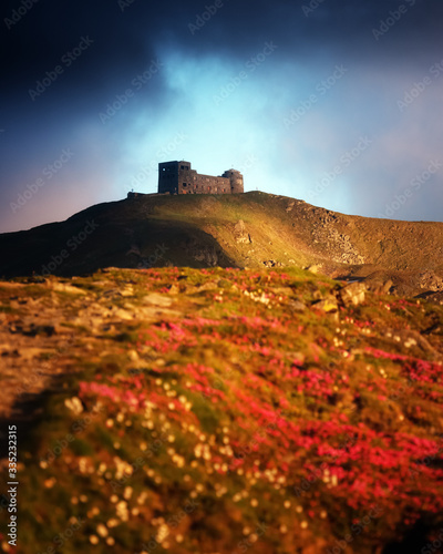 Old Polish observatory White elephant on mt. Pip Ivan top. Spring Carpathians mountains hills covered by pink rhododendron flowers. Landscape photography