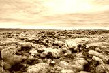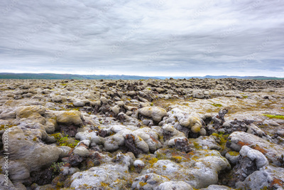 Peculiar Iceland landscape with lava field covered with brown moss Eldhraun from volcano eruption and cloudy sky