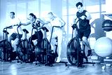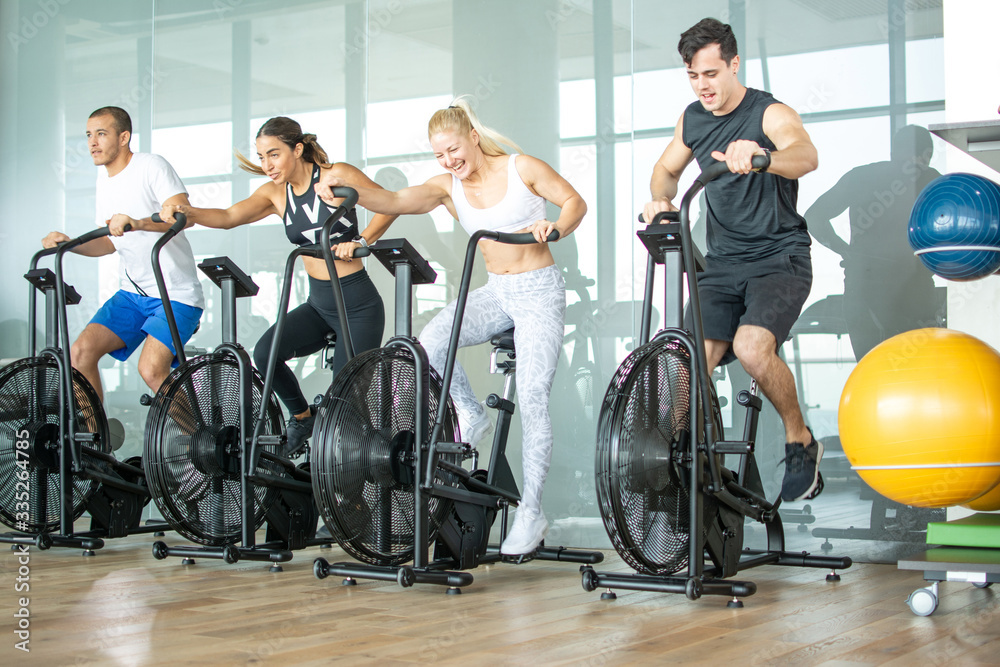 Group of young sporty people doing exercises on elliptical machine at gym