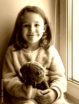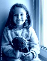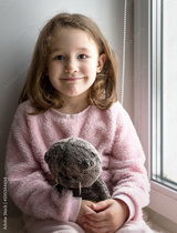 Kid sits by window inside house. Portrait of funny little girl with soft toy in room. Cute adorable child staying at home during quarantine