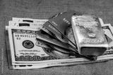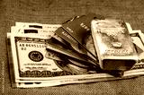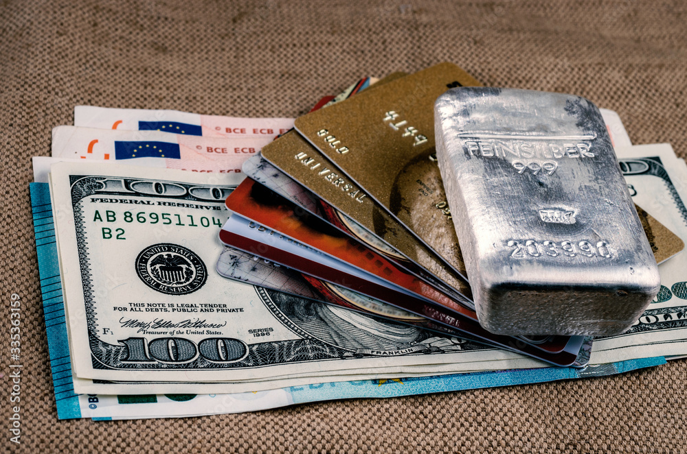 Cash dollars, euros, plastic cards and silver bullion against the background of coarse cloth. Investment portfolio. feinsilber is fine silver..