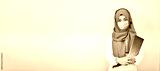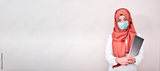 Muslim doctor girl wearing surgical mask for protection. Hijab woman doctor take a mask and holding the notes