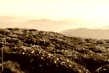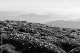 Amazing landscape with charming pink rhododendron flowers at Carpathian mountains. Beautiful nature background and perfect summer wallpaper