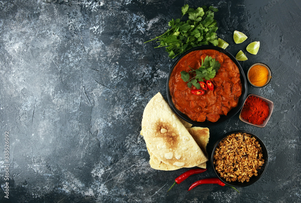 Chicken tikka masala spicy curry meat food in pot with rice and naan bread. indian food on table