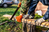 Two people men working in garden for post raised bed cold frame manual sawing wooden board in Ukraine dacha closeup