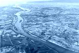 Washington DC, Virginia Dulles International Airport area with aerial view of buildings and Potomac River below in winter from airplane window