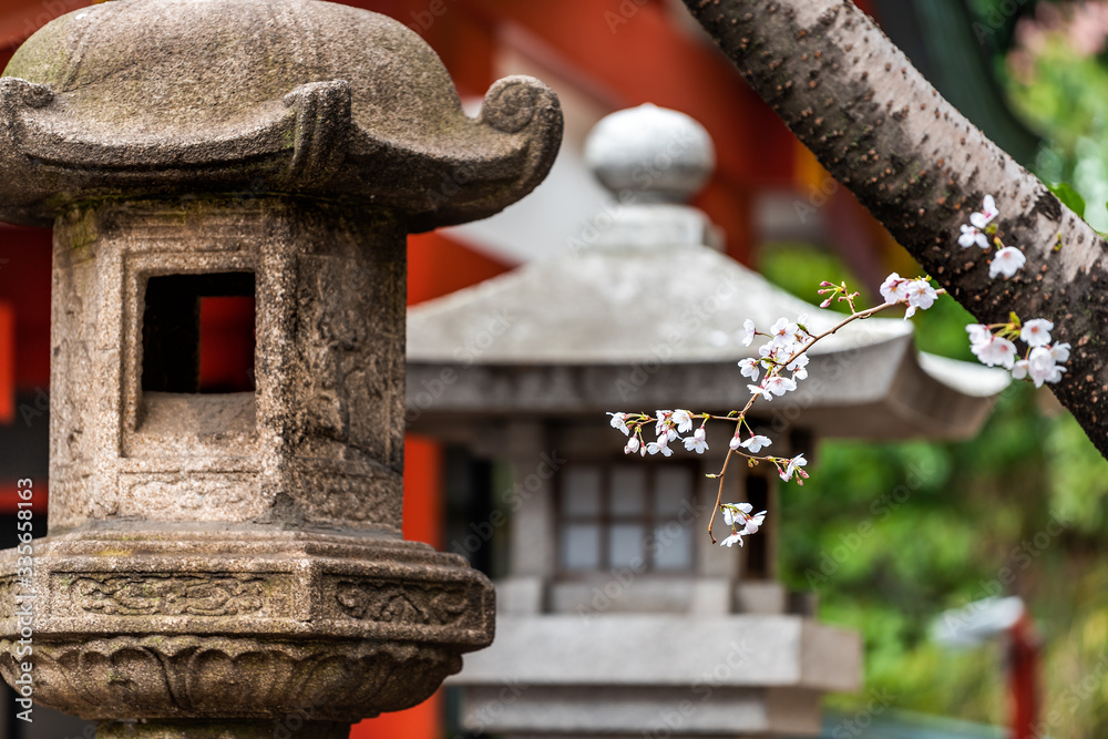 Tokyo, Japan Hie shinto temple shrine with stone lantern closeup and cherry tree branch sakura flowers in springs with blurry background in garden and nobody