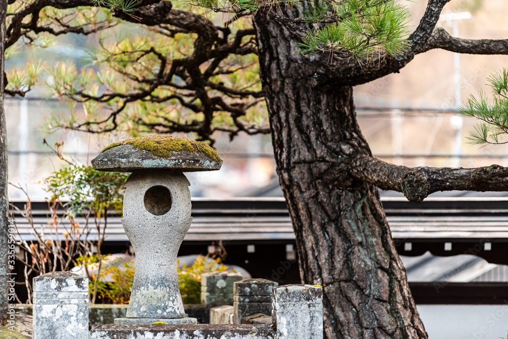 Stone lantern by cedar pine tree in Japanese traditional garden in spring by Shinto shrine temple at Higashiyama walking course in Takayama, Japan of Gifu Prefecture