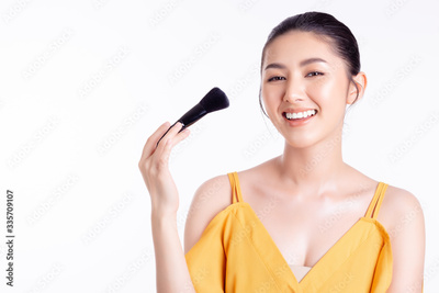 Use makeup brush for make up her beauty face. Attractive beautiful girl get natural makeup by using brush makeup. Pretty woman get happy, smiley face. isolated on white background, studio shot
