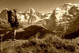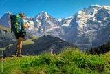 Happy hiker woman with backpack, enjoying the view, Murren, Switzerland