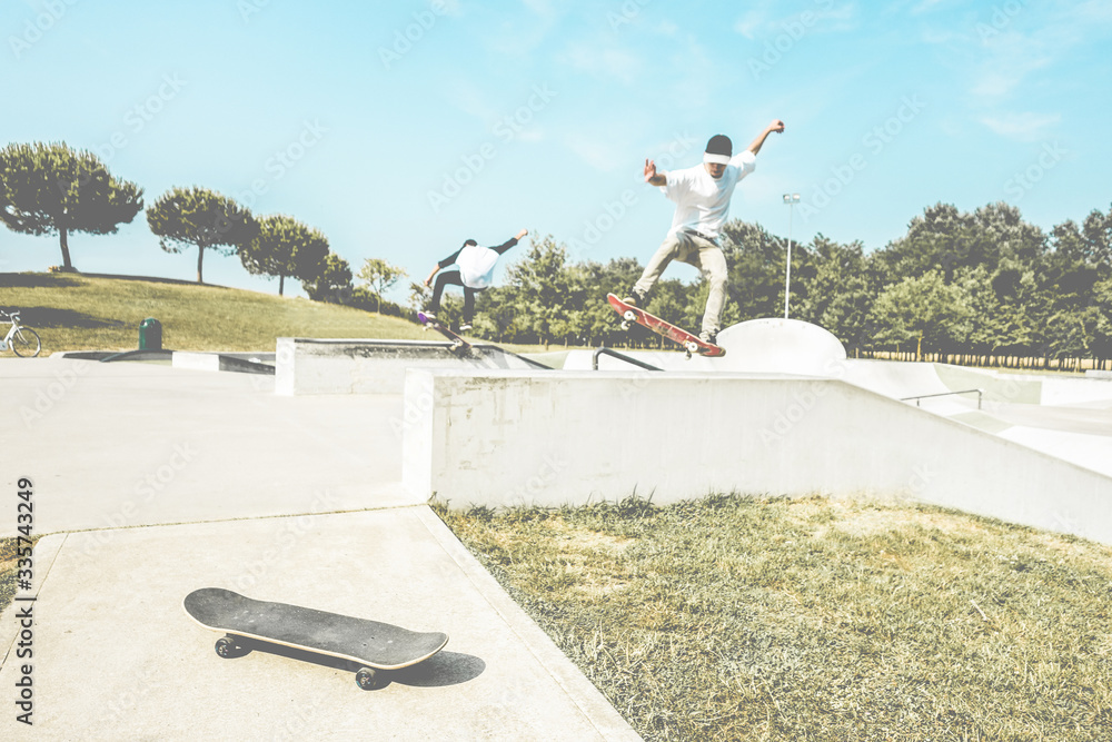 Group of skaters friends performing trick in pubblic park - Young men training outdoor - Extreme sport, youth lifestyle concept- Focus on close-up skateboard