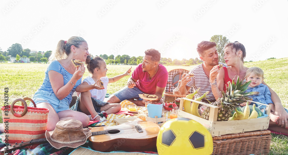 Happy families doing picnic in nature park outdoor - Young parents having fun with children in summer time laughing together - Positive mood and food concept - Focus on people faces