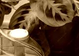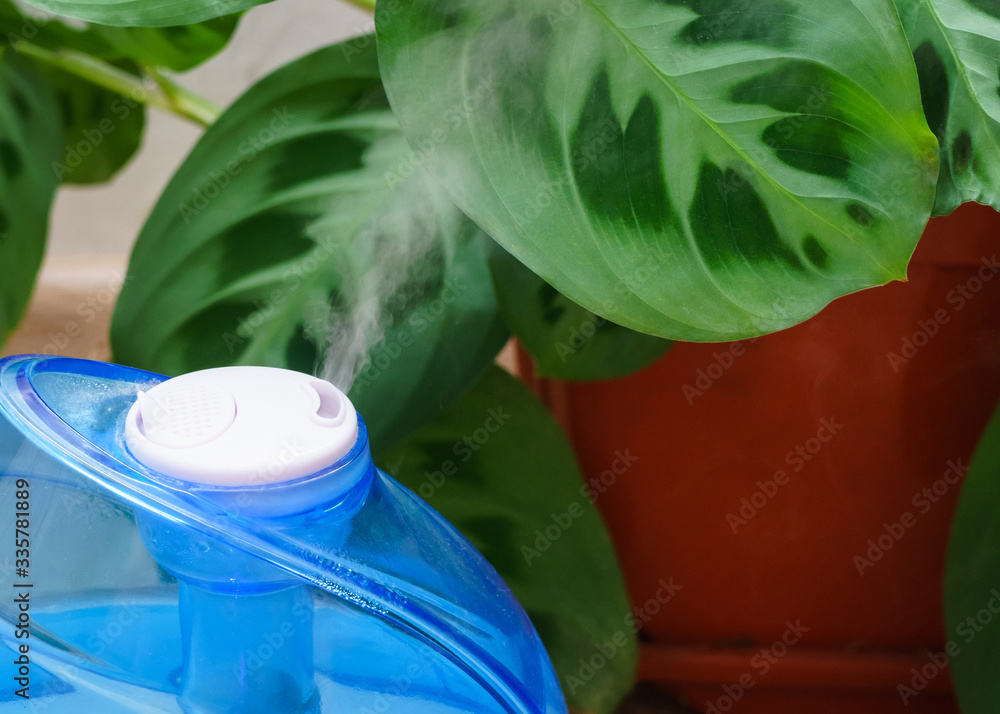 A working humidifier and arrowroot on the background. Humidification for home plants