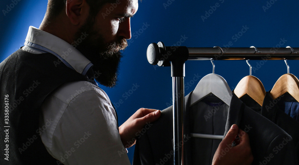 Luxury mens classic suits on rack in elegant men's boutique. Tailor, tailoring. Men's suit, tailor in his workshop. Elegant man's suits hanging in a row. Handsome bearded businessman in classic suit