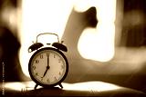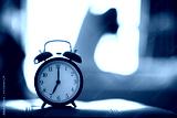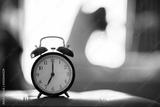 Closeup alarm clock having a good day with background happy woman stretching in bed after waking up, sunlight in morning.