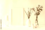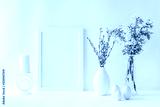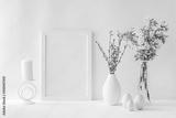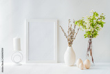 Home interior with easter decor. Mockup with a white frame and spring flowers in a vases on a light background
