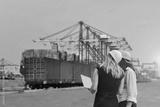 woman engineer worker inspect container with computer box on train platform in port cargo freight for import export shipping with crane bridge in harbor background