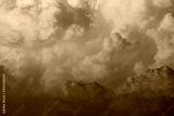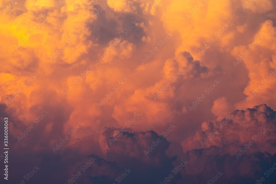 Yellow, orange fluffy clouds on sunset sky background. Art picture of orange clouds texture. Beautiful pattern of clouds. Freedom and calm background. Beauty in nature. Powerful and spiritual scene.