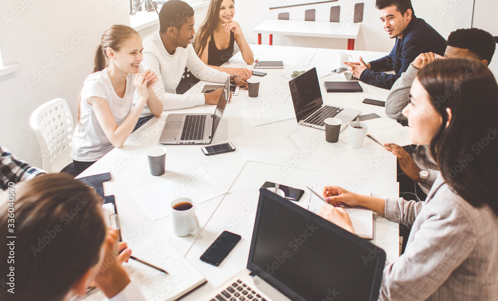 A team of young office workers, businessmen with laptop working at the table, communicating together in an office. Corporate businessteam and manager in a meeting. coworking.