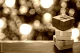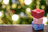 Group of stack small gift box on wooden table with beautiful bokeh light background. Gift or present is an item given to someone without the expectation of payment or anything in return.