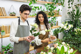 Attractive experienced female florist teaches a young man how to work in a flower shop