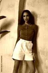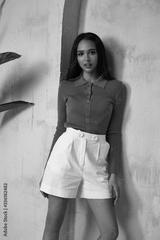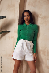 Brunette woman beautiful sexy face cosmetic tanned skin makeup wear white cotton short green top fashion clothes style collection accessory bag interior summer art armchair plant furniture.