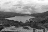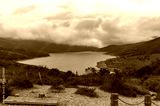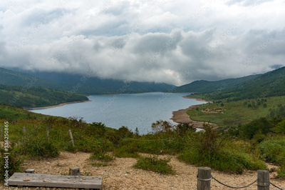 Mountain lake landscape. Nozori lake, dam surrounded by mountains