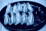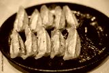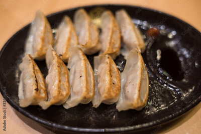 Traditional Japanese gyouza deep fried dumplings on dark plate