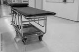 An emergency stretcher without patient at hospital corridor. Stretchers are primarily used in hospital care situations for moving patients who require medical care.
