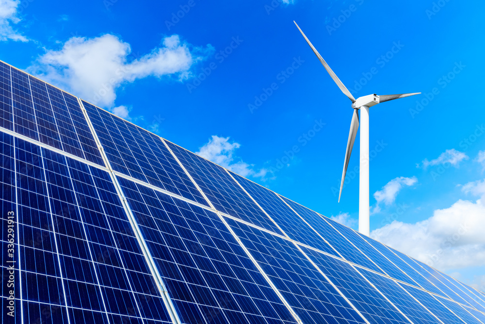 Solar panels with wind turbines on a sunny day,green clean energy concept.